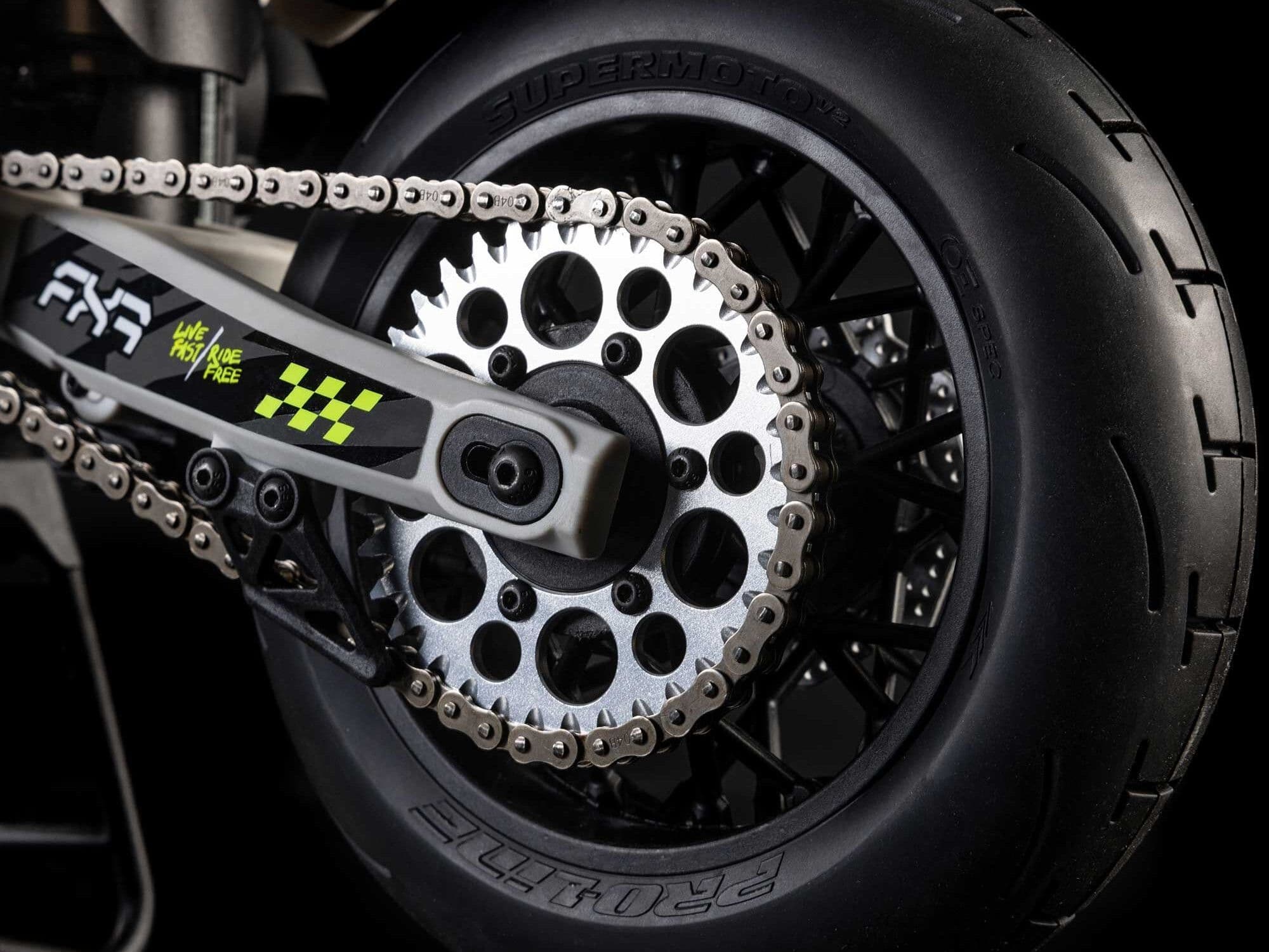 We could not call the Promoto-SM a true street racing bike if wasn't chain driven. Steel links and 70 roller pins wrap around a 10-tooth steel drive sprocket and a 36-tooth aluminium hub sprocket. Regardless of conditions, the chain drive will drive the rear tyre efficiently and reliably.