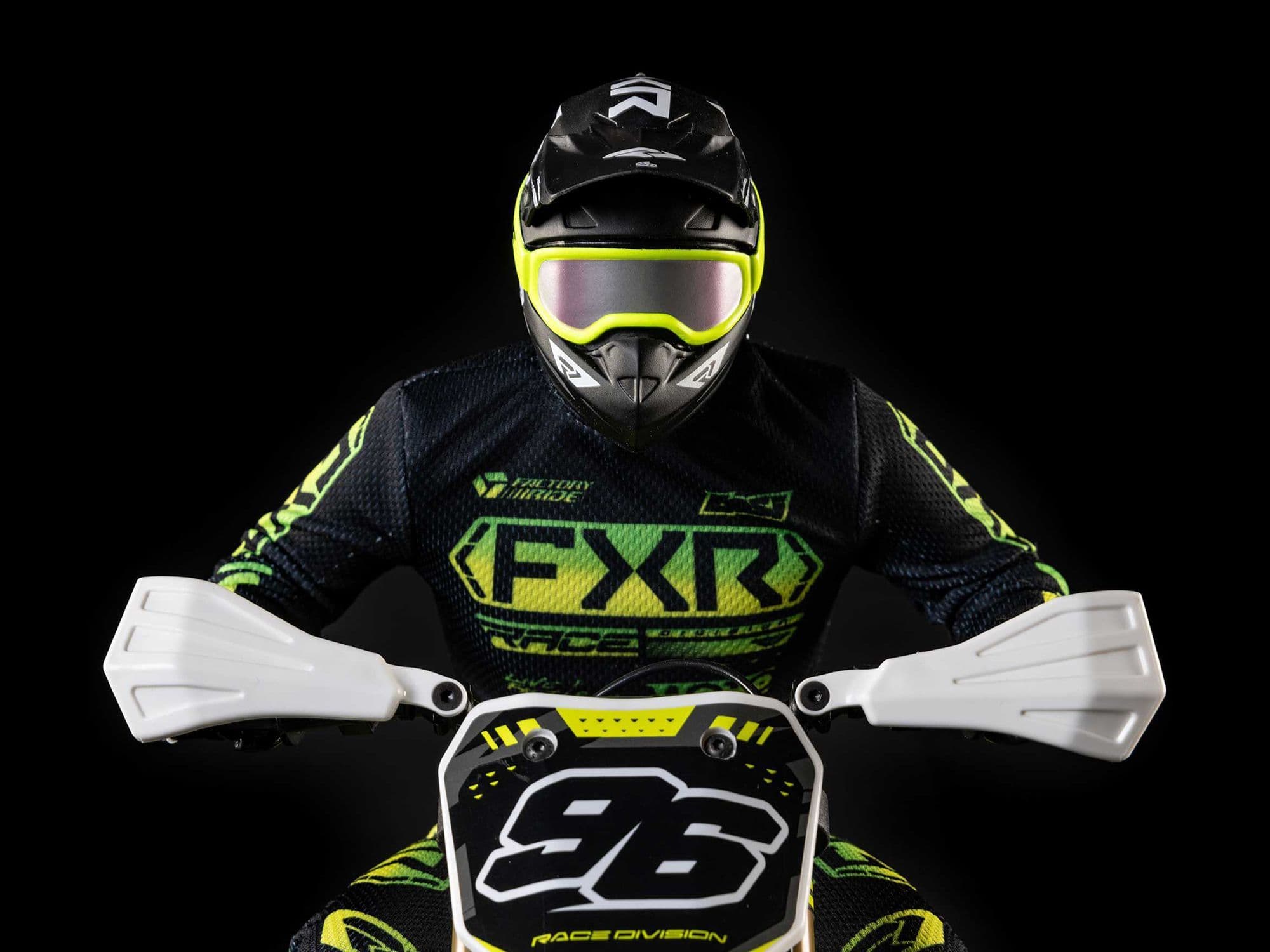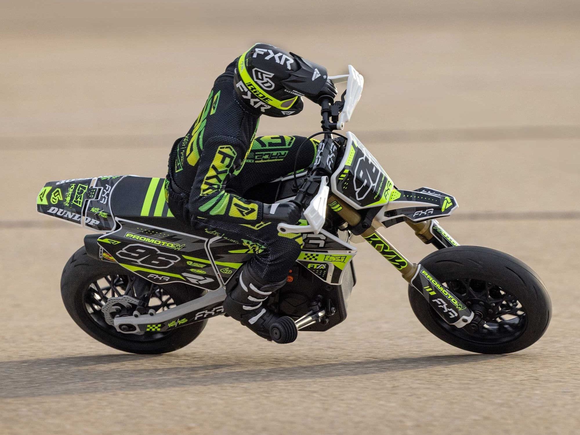 The Losi Promoto-SM also looks like a true supermoto bike. Its distinctive visual details include hand guards, shortened front fender, and officially licensed FXR graphics and rider gear.