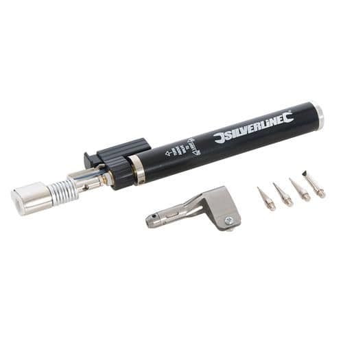 Butane gas torch, electronic ignition, heat adjustment. For jewellery and model making, minor repairs, brazing, welding, rope cutting and shrinking. Easy to use. Refillable with butane lighter fuel. Includes 4 soldering iron tips.