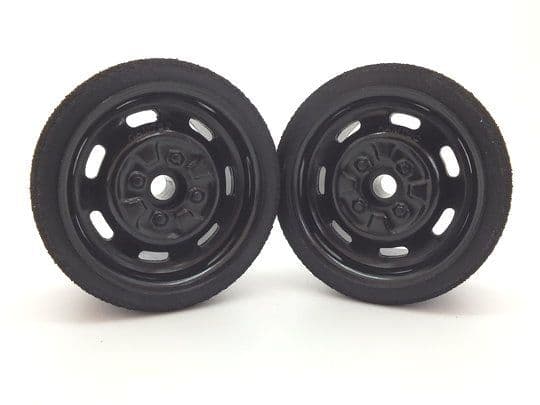 kamtec Black Bearing Front Steel Wheels and UFRA 46 Tyres Trued and Glued Front Bearing Black Steel Wheels Trued and Glued. Top Quality Tyre Tape is used. Will fit Kamtec, Large It, Mardave, Schumacher, TIC, and most 1:12 oval cars Comes as one pair of Kamtec's own Ball Raced Black Steel Wheels, 38mm diametre and 25mm wide, on UFRA 46 Tyres UFRA 46 Tyres - Medium Grip Front Tyre. The most popular front tyre on Bangers, 1300 Stock Cars and 2 Litre Stock Cars. Used most commonly with Pink Medium or King Pin Soft Rear Tyres. UFRA tyres get harder with a higher shore rating, so 38 is soft up to 52 which is the hardest.