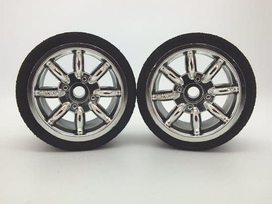 Kamtec Chrome Bearing Front Minilite Wheels and UFRA 46 Tyres Trued and Glued Top Quality Tyre Tape is used. Will fit Kamtec, Large It, Mardave, Schumacher, TIC, and most 1:12 oval cars Comes as one pair of Kamtec's own Ball Raced Chrome Minilite Wheels, 38mm diametre and 25mm wide, on UFRA 46 Tyres UFRA 46 Tyres - Medium Grip Front Tyre. The most popular front tyre on Bangers, 1300 Stock Cars and 2 Litre Stock Cars. Used most commonly with Pink Medium or King Pin Soft Rear Tyres. UFRA tyres get harder with a higher shore rating, so 38 is soft up to 52 which is the hardest.