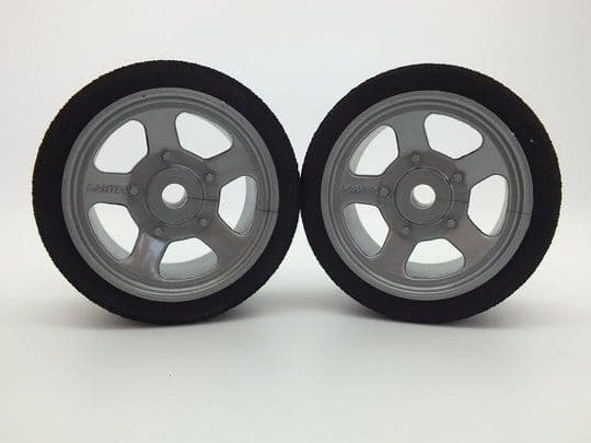 Kamtec Silver Front 5 Spoke Wheels and Jap Medium Tyres for bangers Silver 5 Spoke Wheels Trued and Glued. Top Quality Tyre Tape is used. Will fit Kamtec, Large It, Mardave, Schumacher, TIC, and most 1:12 oval cars Comes as one pair of Kamtec's own Silver 5 Spoke Wheels, 38mm diameter and 25mm wide, on Jap Medium Tyres Jap Medium Tyres - The Highest Grip Front Tyre. Very lively indeed and best in Hot Rods.